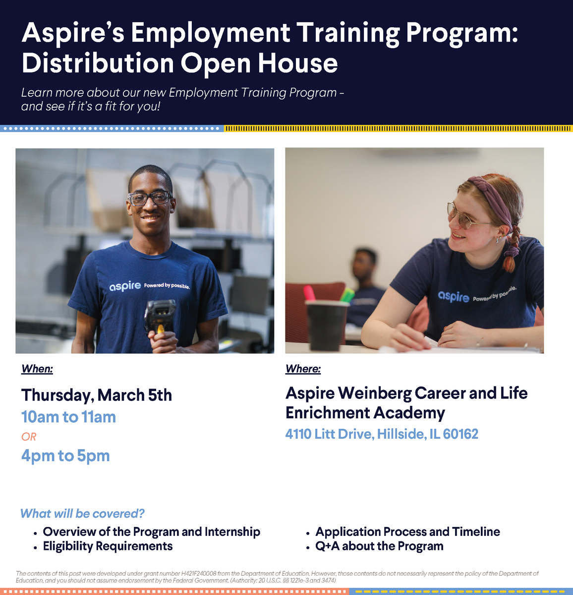 Aspire’s Employment Training Program is hosting a Distribution Open House on March 5, June 3 and September 2.